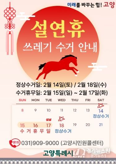 [경기뉴스원/경기뉴스1] | 고양특례시는 설 연휴를 앞두고 시민들이 깨끗하고 쾌적한 환경에서 명절을 보낼 수 있도록 ‘설 연휴 생활쓰레기 관리대책’을 마련하고 비상 대응체계를 운영한다.