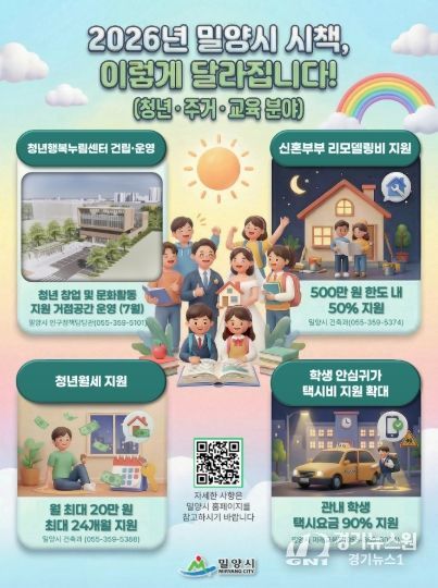 [경기뉴스원/경기뉴스1] | 밀양시는 청년들이 지역에 안정적으로 뿌리 내리고 미래를 설계할 수 있도록 주거와 교육, 문화가 어우러진 ‘청년 친화 도시’ 조성에 행정력을 집중한다. 2026년 청년 정책의 핵심은 청년들의 거점 공간 마련과 안정적인 주거 사다리를 구축하는 것이다.