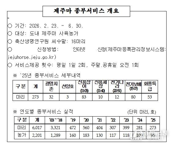 [경기뉴스원/경기뉴스1] | 제주특별자치도 축산생명연구원이 오는 23일부터 6월 30일까지 제주마 사육농가를 대상으로 ‘무상 종부(교배) 서비스’를 운영한다.