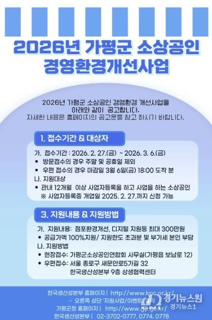 [경기뉴스원/경기뉴스1] | 가평군은 관내 소상공인의 지속경영 기반을 강화하기 위해 ‘2026년 가평군 소상공인 경영환경개선사업’ 대상자를 3월 6일까지 모집한다고 밝혔다.