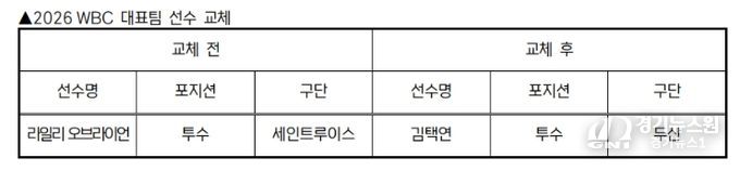 [경기뉴스원/경기뉴스1] | KBO 전력강화위원회는 부상으로 인해 WBC 참가가 어려워진 세인트루이스 라일리 오브라이언을 대체할 선수로 두산 김택연을 확정하고 WBC 조직위에 선수 교체 승인을 요청했다.