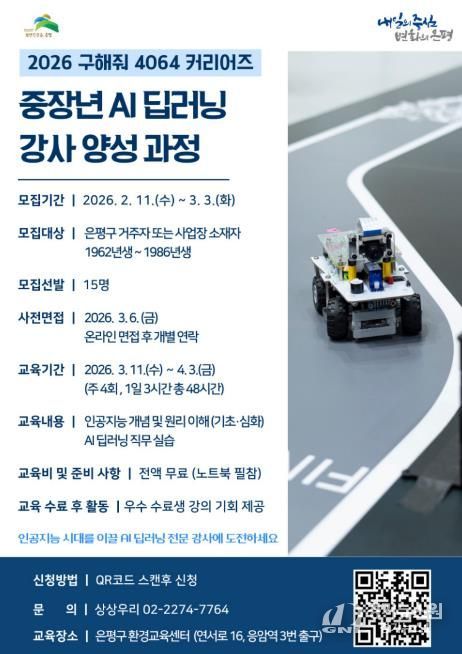 [경기뉴스원/경기뉴스1] | 서울 은평구는 다음 달 3일까지 중장년층의 디지털 직무 전환과 재취업 지원을 위해 ‘AI 딥러닝 강사 양성 과정’ 참여자를 모집한다고 밝혔다.