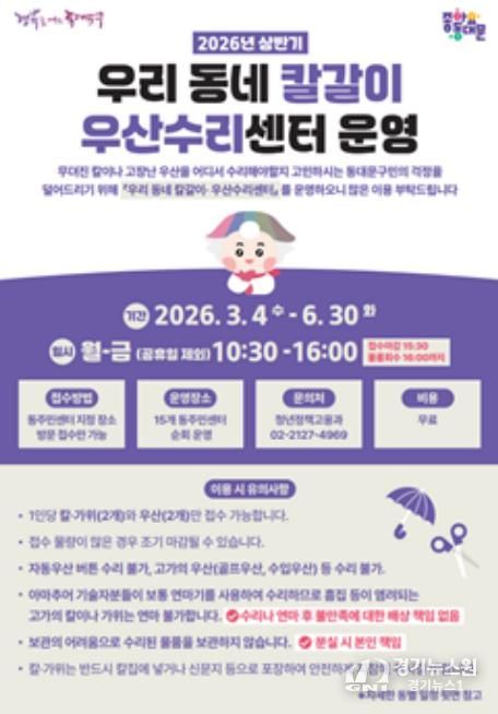 [경기뉴스원/경기뉴스1] | 서울 동대문구는 ‘불편을 줄이는 공공서비스가 곧 일자리’라는 방향 아래, 3월 초부터 ‘찾아가는 방문 소독’과 ‘우리 동네 칼갈이·우산수리센터’를 본격 가동한다고 밝혔다. 행정이 먼저 움직여 주민 삶의 틈을 메우자는 취지다.