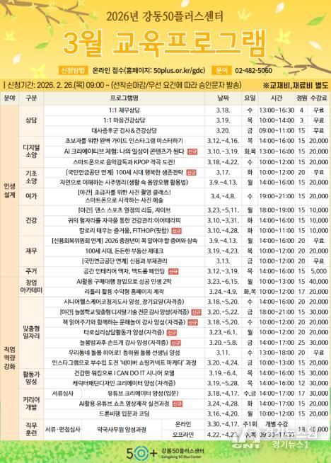 [경기뉴스원/경기뉴스1] | 서울 강동구는 오는 2월 26일부터 강동50플러스센터 3월 교육 프로그램 수강생을 모집한다고 밝혔다.