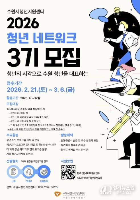 [경기뉴스원/경기뉴스1] | 수원시청소년청년재단 수원시청년지원센터는 2월 21일부터 3월 6일까지 2026년 청년 네트워크 단원 32명을 모집한다.