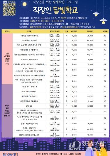 [경기뉴스원/경기뉴스1] | 화성특례시는 2월 26일부터 3월 6일까지 직장인 달빛학교 1차 수강생을 선착순으로 모집한다고 밝혔다.