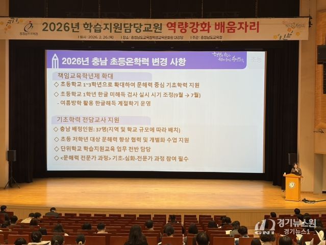 [경기뉴스원/경기뉴스1] | 충남교육청은 26일 충남교육청학생교육문화원(천안)에서 2026년 학습 지원 담당 교원 410명과 14개 시군 교육지원청 기초학력 담당 장학사를 대상으로 배움자리를 개최했다.