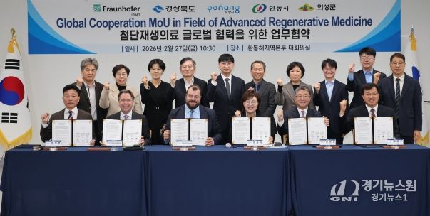 [경기뉴스원/경기뉴스1] | 포항시는 27일 경상북도 동부청사에서 경상북도, 안동시, 의성군과 함께 독일 프라운호퍼 생체의공학 연구소(IBMT)와 ‘첨단재생의료산업 육성을 위한 공동 협력 양해각서(MOU)’를 체결했다.