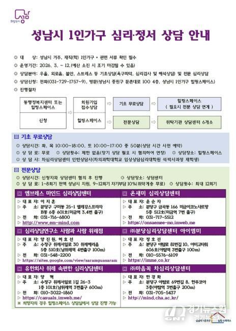 [경기뉴스원/경기뉴스1] | 성남시는 우울감이나 외로움, 불안감, 스트레스로 어려움을 겪는 1인 가구에 전문적인 심리·정서 상담을 지원한다고 5일 밝혔다.