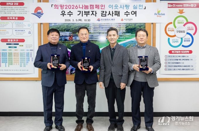 [경기뉴스원/경기뉴스1] | 부산 북구는 희망2026나눔캠페인 기간 이웃사랑 실천에 앞장선 우수 기부자에게 부산사회복지공동모금회(회장 이수태) 감사패를 수여했다고 밝혔다.