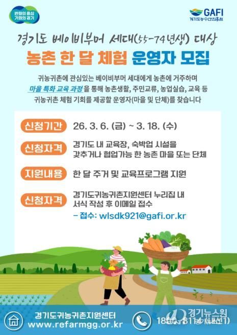 [경기뉴스원/경기뉴스1] | 경기도와 경기도농수산진흥원은 ‘경기도 베이비부머 농촌 한 달 체험’을 운영할 마을·단체 2곳을 오는 18일까지 모집한다.