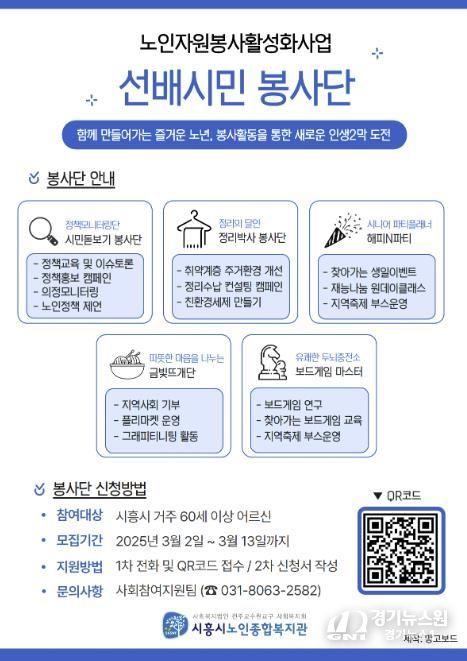 봉사단 인원은 총 10명을 선정할 계획으로, 모집 기간은 3월 13일까지다. 신청은 시흥시노인종합복지관 사회참여지원팀으로 전화하거나 홍보 포스터의 정보무늬(큐알코드)를 통해 하면 된다.