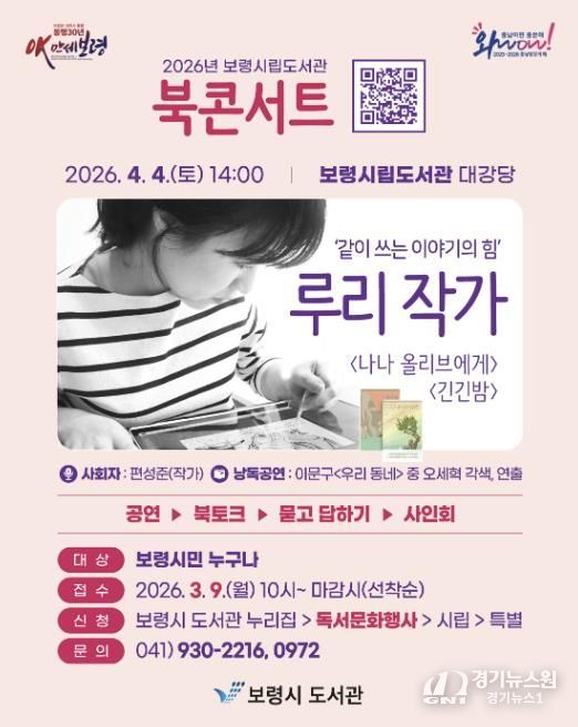 [경기뉴스원/경기뉴스1] | 보령시는 4월 4일 토요일 오후 2시 보령시립도서관 대강당에서 베스트셀러 『긴긴밤』의 저자 루리 작가를 초청해 북콘서트를 개최한다고 밝혔다.