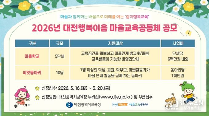 [경기뉴스원/경기뉴스1] | 대전시교육청은 마을과 학교가 협력하는 교육생태계 조성을 위해 ‘2026년 마을교육공동체 마을학교 및 씨앗동아리’를 공모한다고 밝혔다.