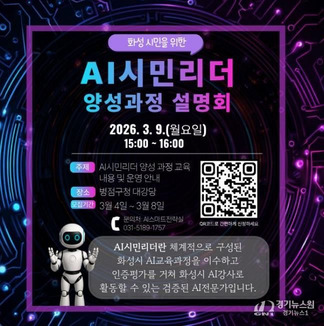 [경기뉴스원/경기뉴스1] | 화성특례시는 시민이 학습하고 교육하는 인공지능(AI) 학습 체계 구축을 위해 ‘2026년 AI시민리더 양성 교육’ 설명회를 3월 9일 오후 3시에 병점구청 대강당에서 개최한다.