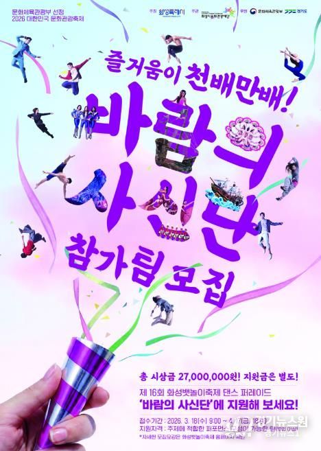 [경기뉴스원/경기뉴스1] | (재)화성시문화관광재단은 제16회 화성 뱃놀이 축제의 주인공이 될 ‘바람의 사신단 댄스 퍼레이드‘경연 참가팀을 모집한다.