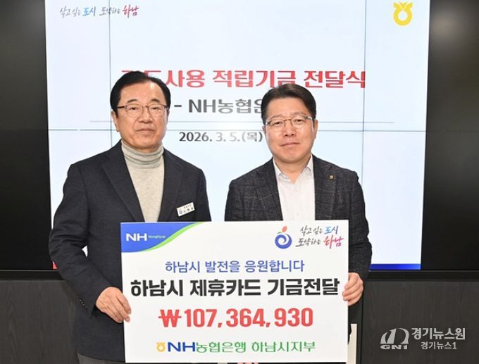 [경기뉴스원/경기뉴스1] | NH농협은행 하남시지부가 5일 제휴카드 사용 적립기금 107,364,930원 하남시에 전달했다고 밝혔다.