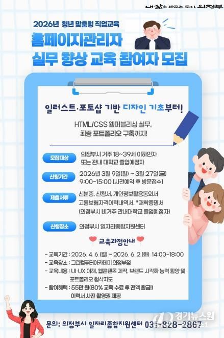 [경기뉴스원/경기뉴스1] | 의정부시는 사회에 첫발을 내딛는 청년과 전직 희망자를 위해 4월 6일부터 6월 2일까지 9주간 ‘홈페이지 관리자 실무 향상 교육’을 운영한다.