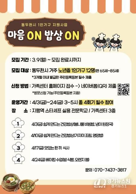 “1인 가구 식생활 개선 다이닝 – 마음 ON 밥상 ON”은 경기도와 동두천시의 지원을 받아 추진되는 2026년 동두천시 1인 가구 지원사업의 일환으로, 4월 노년층 프로그램을 시작으로 9월 중장년층, 10월 청년층 프로그램이 순차적으로 운영된다.