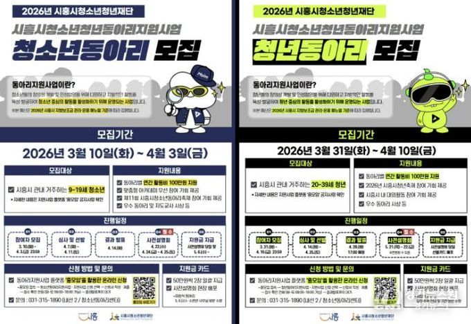 [경기뉴스원/경기뉴스1] | 시흥시와 시흥시청소년청년재단은 지역 청소년과 청년의 자율적인 동아리 활동을 지원하고 건강한 문화 형성을 위해 ‘2026년 시흥시 청소년ㆍ청년 동아리 지원사업’에 참여할 동아리 670개를 모집한다고 밝혔다.