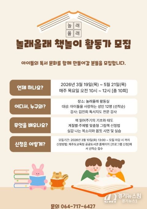 [경기뉴스원/경기뉴스1] | 제주도교육청 제주도서관은 19일부터 성인을 대상으로 전문적인 책놀이 활동가 양성을 위한 ‘놀래올래 책놀이 활동가 교육’ 프로그램을 운영한다.