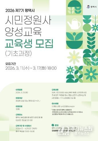 [경기뉴스원/경기뉴스1] | 평택시는 ‘제7기 평택시 시민정원사 양성과정(기초)’에 함께할 시민 교육생을 모집한다고 밝혔다.