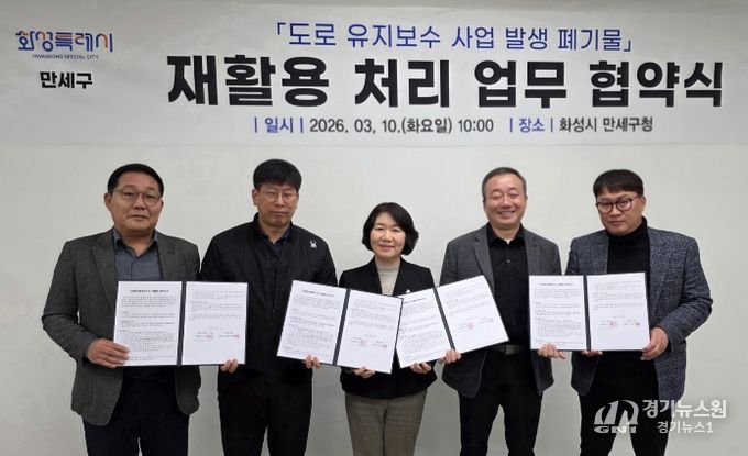 [경기뉴스원/경기뉴스1] | 화성특례시 만세구가 도로 유지보수 과정에서 발생하는 폐기물을 효율적으로 처리하고 자원 재활용을 확대하기 위해 관내 아스콘 생산 업체와 ‘폐아스콘 재활용 처리 협약’을 체결했다.