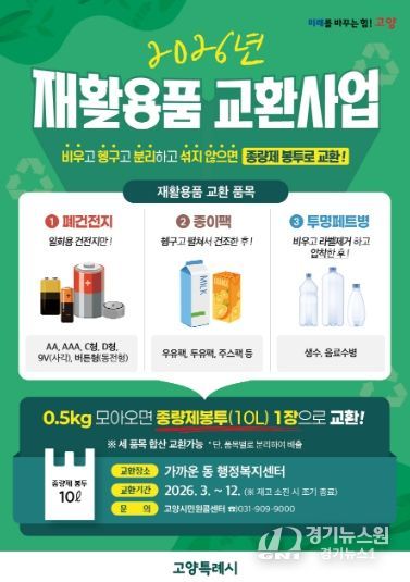 [경기뉴스원/경기뉴스1] | 고양특례시 덕양구 창릉동은 주민들의 자원 재활용 참여를 확대하고 올바른 분리배출 문화를 정착시키기 위해 ‘2026년 재활용품 교환사업’을 운영한다고 밝혔다.