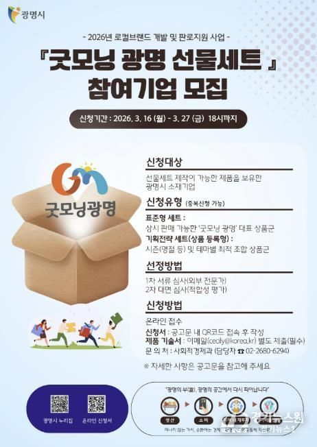 모집 대상은 선물세트 제작이 가능한 제품을 보유한 광명시 소재 중소기업, 사회적경제기업, 소상공인 등이다. 광명에서 생산·제조한 생활용품, 식품, 공예품 등 특판이 가능한 전 품목이 해당하며, 선정된 제품은 ‘굿모닝광명’ 브랜드 로고와 전용 패키지를 입혀 세련된 세트 상품으로 재탄생한다.
