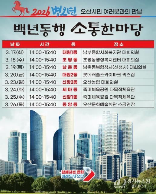 [경기뉴스원/경기뉴스1] | 오산시가 시민과 직접 만나 시정 운영 방향을 공유하고 지역 현안을 듣는 ‘2026 백년동행 소통한마당’을 개최한다.