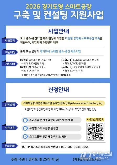 [경기뉴스원/경기뉴스1] | 수원특례시가 경기도와 함께 ‘2026년 경기도형 스마트공장 구축 및 컨설팅 지원사업’ 참여 기업을 공모한다. 경기도 22개 시군 소재 중소제조기업을 지원하는데, 수원시 기업은 4개사를 선정할 예정이다.