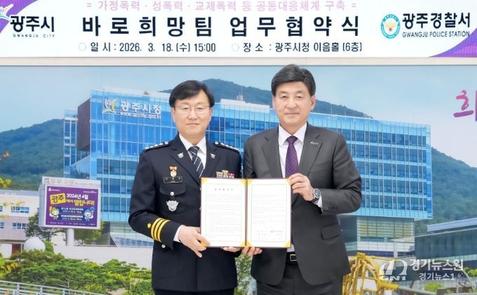 [경기뉴스원/경기뉴스1] | 광주시는 18일 시청 이음홀에서 광주경찰서와 가정폭력·성폭력·교제 폭력 등 폭력 피해자에 대한 공동 대응을 위해 ‘바로희망팀’ 업무협약을 체결했다.