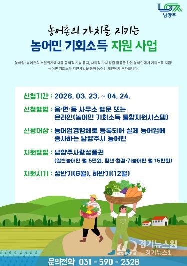 [경기뉴스원/경기뉴스1] | 남양주시는 오는 23일부터 ‘2026년 농어민 기회소득 지원사업’을 신청받는다고 18일 밝혔다.