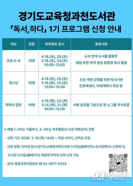 [경기뉴스원/경기뉴스1] | 경기도교육청과천도서관이 지역주민의 독서 역량 강화와 융합적 사고력 함양을 위해 '2026년 독서, 하다’프로그램을 운영한다.