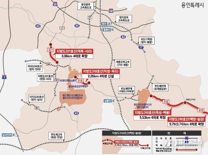 [경기뉴스원/경기뉴스1] | 용인특례시는 경기도 ‘제4차 경기도 도로 건설 계획’에 321호선 역북~서리 구간 확장과 지방도 318호선 덕성~묵리 구간 신설 등 4개 도로 확장‧신설 사업이 반영됐다고 24일 밝혔다.