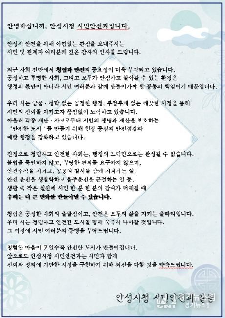 [경기뉴스원/경기뉴스1] | 안성시는 각종 안전점검 과정에서 청렴 안내문을 배부하는 ‘청렴한 안전점검’을 추진하며 시민 청렴의식 제고에 나선다.