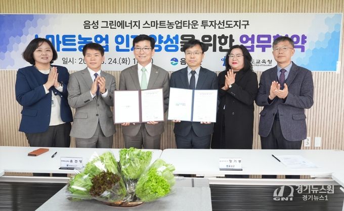 [경기뉴스원/경기뉴스1] | 음성군은 24일 H&A 스마트팜과 그린에너지 스마트농업타운 대상지 일원에서 충청북도교육청과 함께 지역 교육발전 방향과 미래 인재 양성 협력방안을 모색하기 위한 정책간담회를 열고 공동협약을 체결했다.