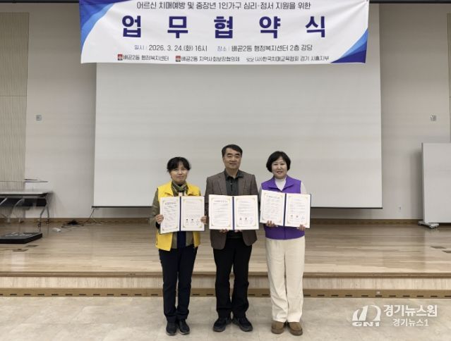 [경기뉴스원/경기뉴스1] | 시흥시 배곧2동 행정복지센터는 지난 3월 24일 행정복지센터 2층 강당에서 배곧2동 지역사회보장협의체, (사)한국치매교육협회 경기 시흥지부와 ‘어르신 치매예방 및 중장년 1인 가구 정서 지원을 위한 업무협약’을 체결했다.
