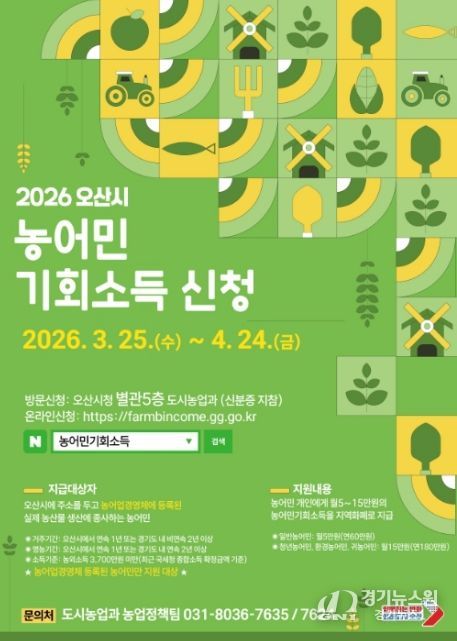 [경기뉴스원/경기뉴스1] | 오산시는 농업·농촌의 공익적 가치 보장과 농어촌 소멸위기 대응을 위해 ‘2026년 농어민 기회소득’ 신청·접수를 3월 25일부터 4월 24일까지 진행한다고 밝혔다.