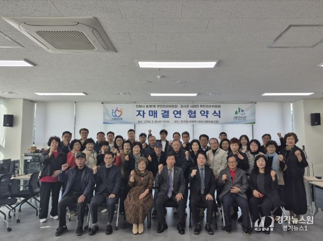 [경기뉴스원/경기뉴스1] | 안양시 동안구 호계1동 주민자치위원회는 지난 25일 호계1동 행정복지센터에서 충북 괴산군 사리면 주민자치위원회와 상생 발전 및 도농 교류 활성화를 위한 자매결연 협약을 체결했다.