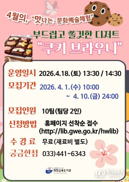 [경기뉴스원/경기뉴스1] | 화천교육도서관은 지역주민을 대상으로 4월부터 11월까지 평생학습 주말 특강 ‘맛과 멋으로 함께하는 문화예술체험’을 운영한다.
