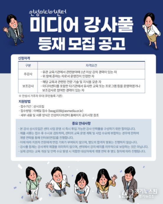 [경기뉴스원/경기뉴스1] | 안성시는 4월 1일부터 보다 체계적이고 전문적인 미디어 교육 운영을 위해 ‘미디어 강사풀’ 등재 강사를 상시 모집한다.