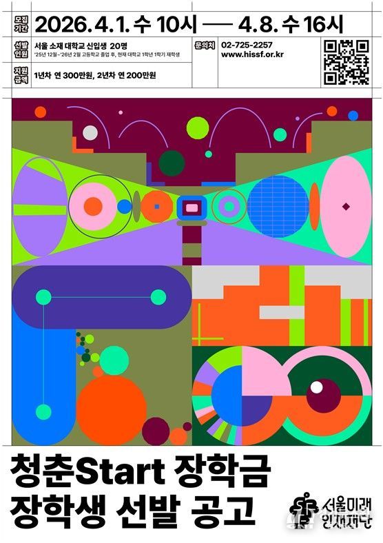 [경기뉴스원/경기뉴스1] | 서울미래인재재단이 ㈜두산 임직원 기부금으로 14년째 운영 중인 '청춘Start장학금' 14기 장학생 20명을 모집한다. 서울 소재 대학에 올해 입학한 저소득 신입생을 대상으로 2년간 총 500만 원의 학업장려금을 지급하며, 신청은 4월 8일 16시까지 재단 누리집에서 받는다.