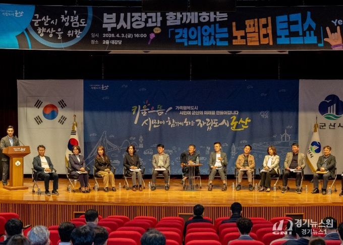 [경기뉴스원/경기뉴스1] | 군산시는 3일 오후 시청 2층 강당에서 저연차 직원들과 간부 공무원들이 격식 없이 소통하는 ‘부시장과 함께하는 격의 없는 노필터 토크쇼’를 개최했다고 밝혔다.