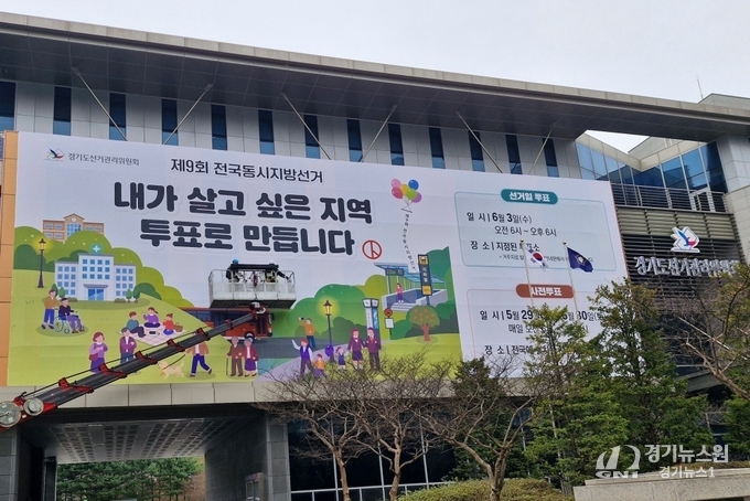 경기도선거관리위원회는 4월 9일 오전 10시 30분, 제9회 전국동시지방선거 투표참여 홍보를 위한 대형 외벽 현수막을 게시했다. 이번 홍보는 유권자의 참여를 독려하고 공정한 선거 분위기를 조성하기 위해 추진됐다.
