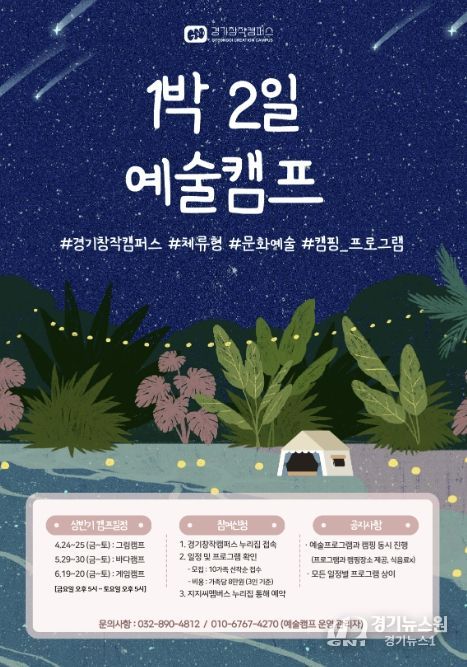 《예술캠프》는 경기창작캠퍼스 인근 숙박시설과 연계해 운영하며, 참여 신청은 경기창작캠퍼스 누리집을 통해 가능하다. 가족 단위 선착순으로 모집하며, 자세한 내용은 누리집에서 확인할 수 있다.