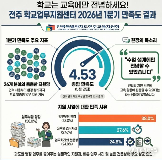 이번 조사는 전주 관내 학교 관리자, 교사, 행정직원 등 실제 지원을 받은 269명을 대상으로 진행됐으며, 현장 중심의 행정 서비스가 학교의 실질적인 업무 부담을 낮추고 있음을 입증했다.