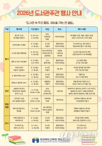 [경기뉴스원/경기뉴스1] | 경상북도교육청 청송도서관이 2026년 4월 도서관주간을 맞이하여 ‘도서관 속 작은 펼침, 세상을 여는 큰 열림’을 주제로 다양한 독서·문화 프로그램을 운영한다.