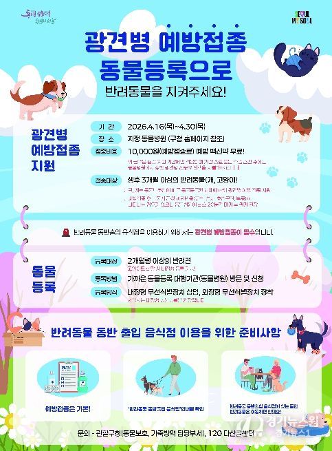 [경기뉴스원/경기뉴스1] | 서울 강서구는 따뜻한 봄철을 맞아 반려동물과 구민의 안전을 지키기 위해 ‘2026년 봄철 광견병 예방접종’ 지원에 나선다.