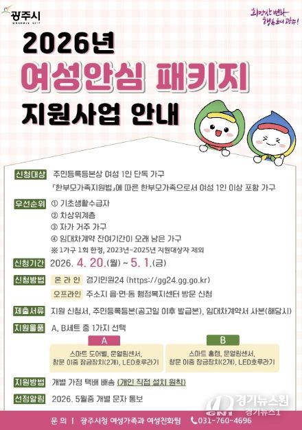 [경기뉴스원/경기뉴스1] | 광주시는 여성 1인 가구와 한부모가족의 생활 안전 강화를 위해 ‘여성 안심 종합 지원사업’ 대상자 35가구를 오는 20일부터 5월 1일까지 모집한다고 17일 밝혔다.